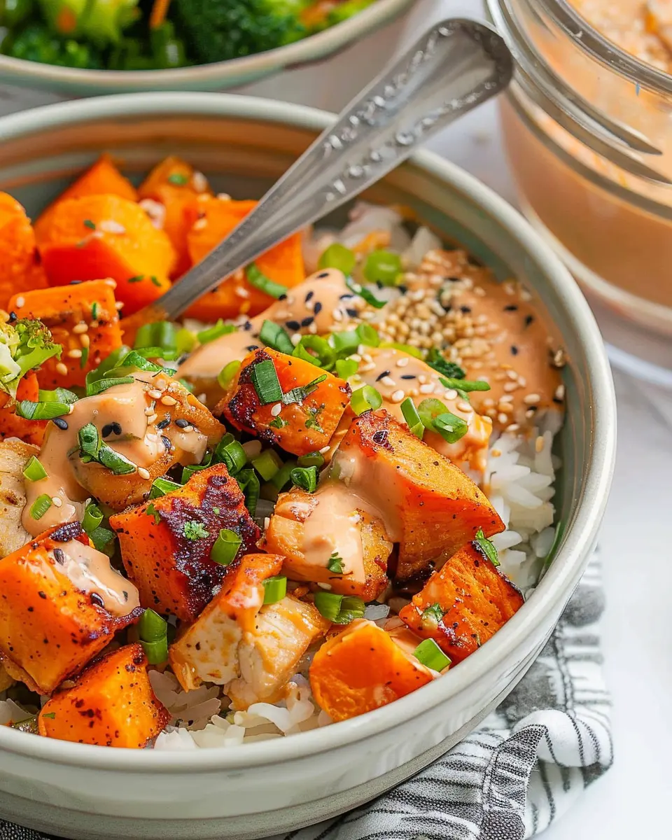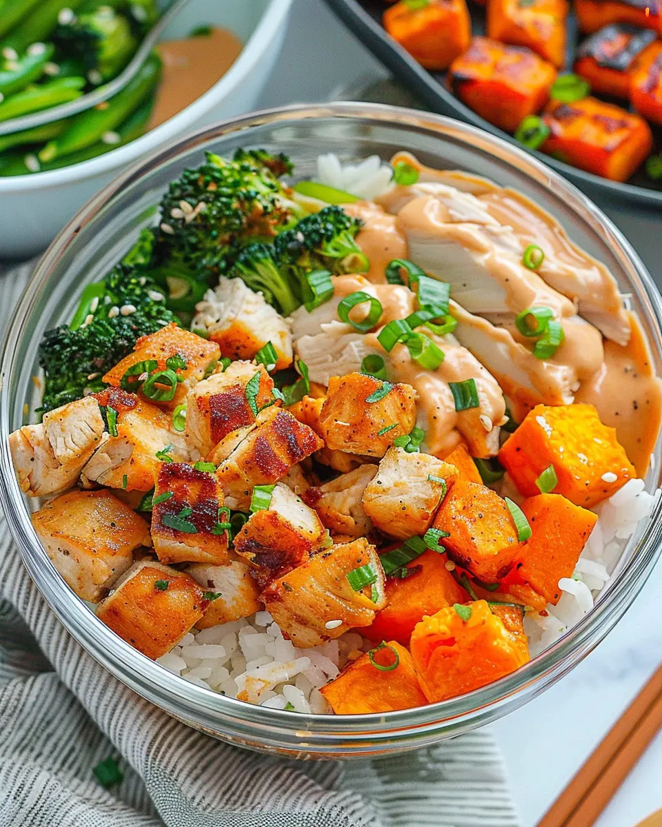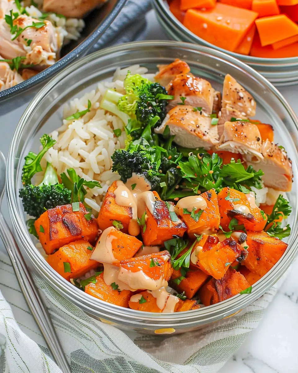 Now comes the fun part—assembly! Start with a base of rice in a bowl. Layer on roasted sweet potatoes and broccoli, followed by your baked chicken, sliced or diced. Drizzle the chipotle sauce generously over the top, or serve it on the side if preferred.