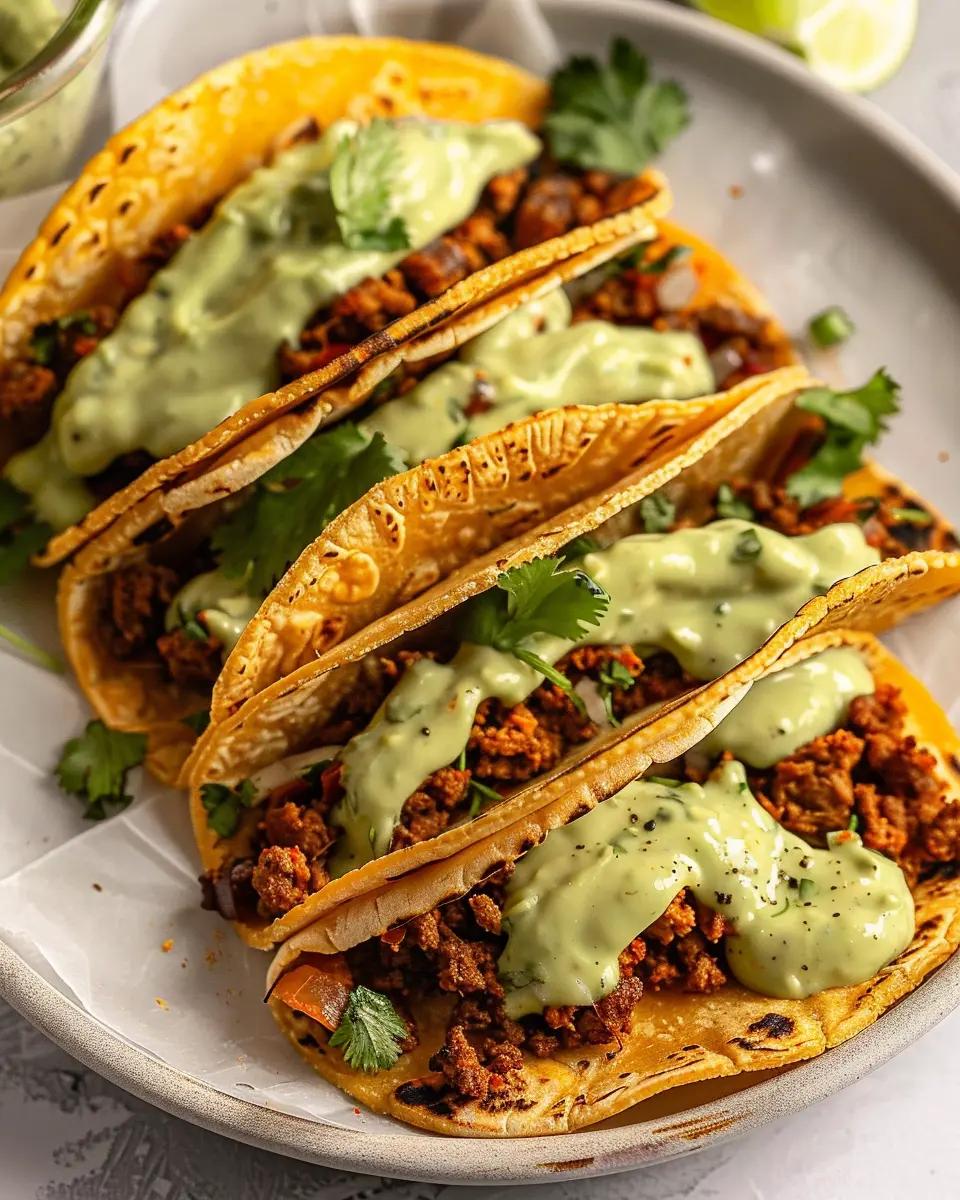 PrintCrispy Baked Ground Turkey Tacos with Creamy Avocado Sauce