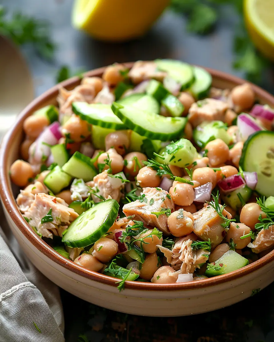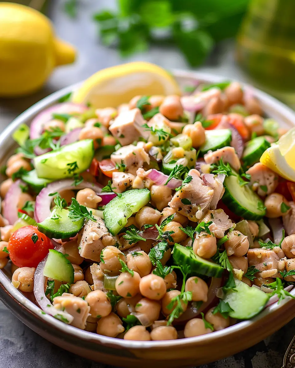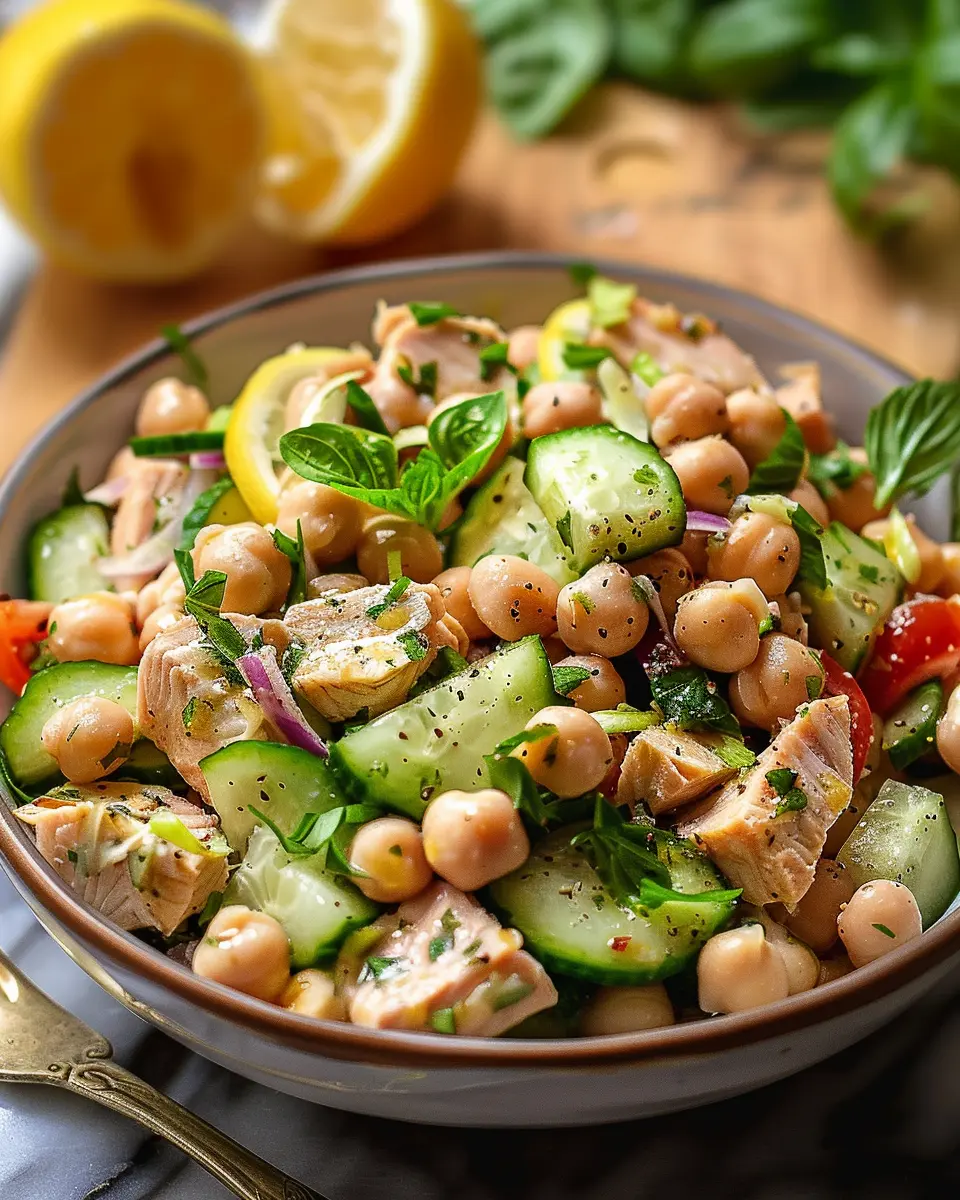 Combining tuna and chickpeas in our healthy tuna garbanzo bean salad not only results in a delicious dish but also supports your nutritional needs. The texture contrasts—creamy tuna with the hearty, nutty chickpeas—against a backdrop of crisp vegetables make this salad visually appealing and irresistible.