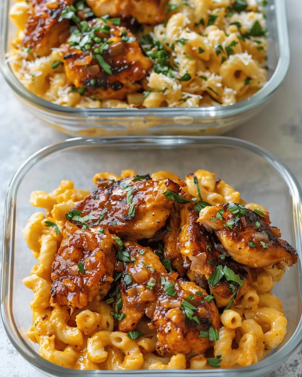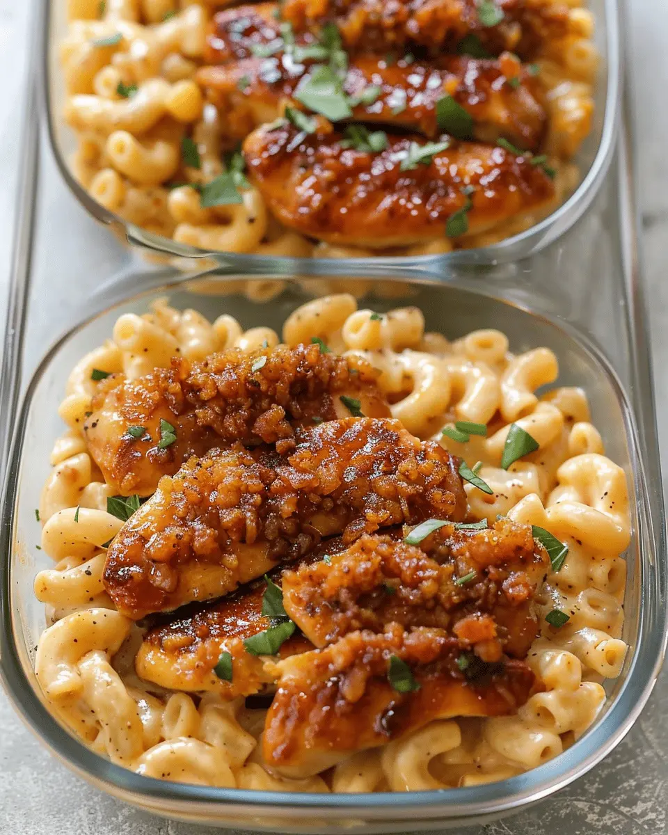 PrintHigh Protein Honey Garlic Butter Chicken with Turkey Bacon Mac & Cheese