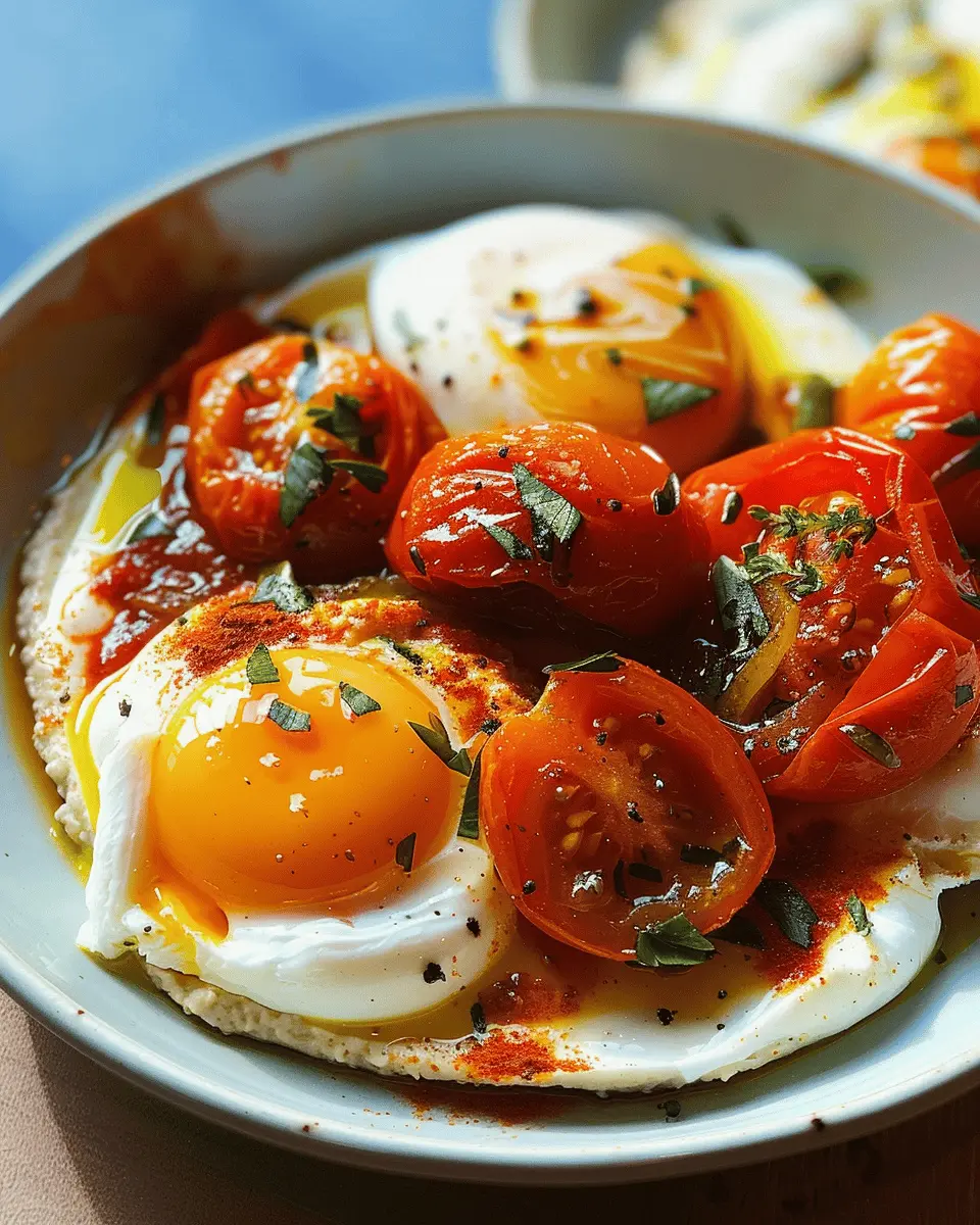 PrintPoached Eggs with Roasted Tomatoes: Easy Delight with Hummus