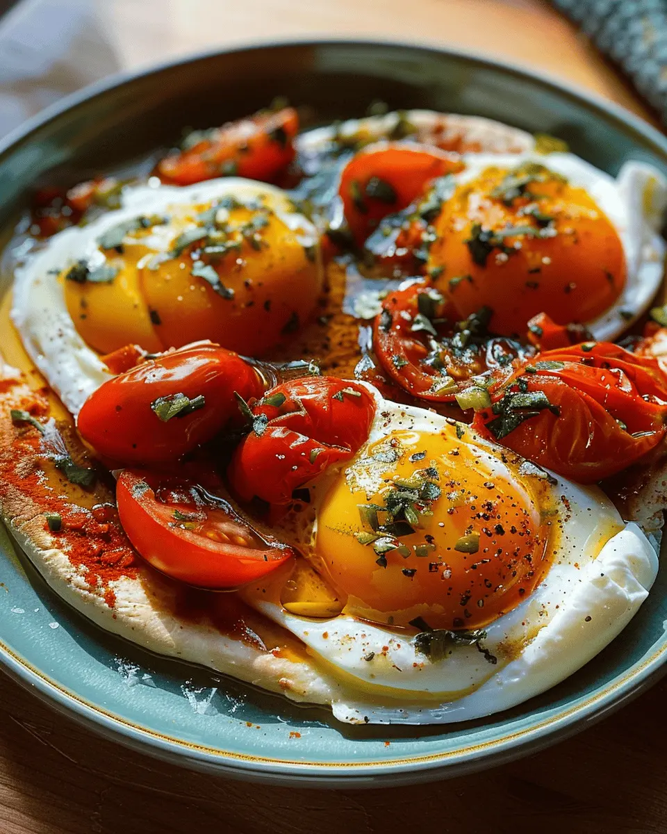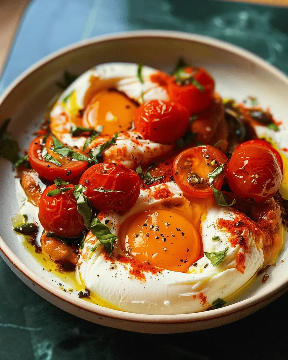 Now that all components are ready, it’s time for the fun part—assembling your dish! Start by plating a generous scoop of hummus as a base; its creamy texture pairs beautifully with both the roasted tomatoes and poached eggs. Next, add the roasted tomato mixture on top of the hummus, and finally, delicately place the poached eggs right on top.