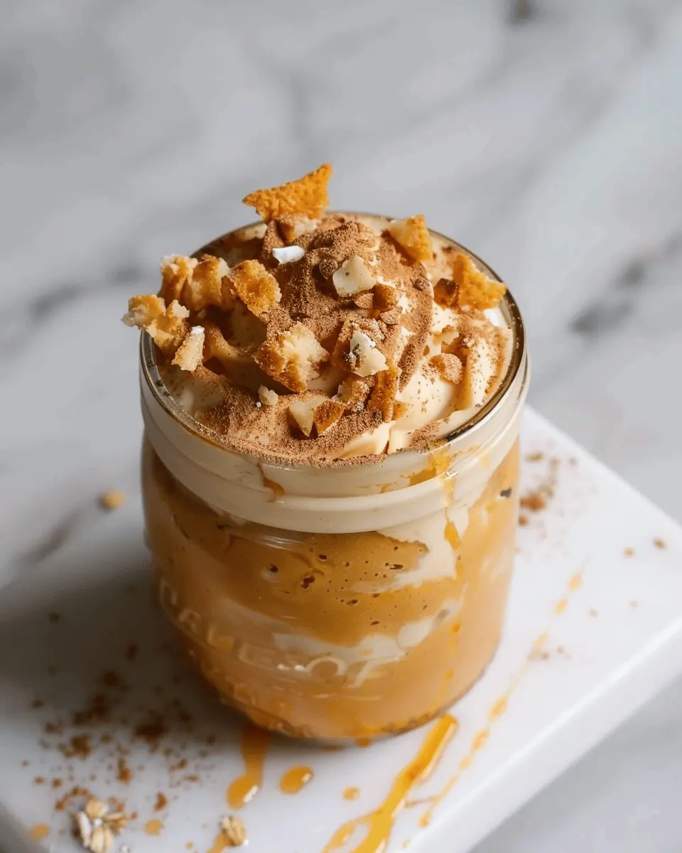 To assemble your Pumpkin Cheesecake Overnight Oats, you’ll need jars or airtight containers. Start by adding a layer of the oat mixture to the bottom of the jar—just enough to cover the base. Then, scoop a generous amount of the cheesecake layer on top of the oats. Repeat the process, creating multiple layers until you’ve used up all your mixtures.