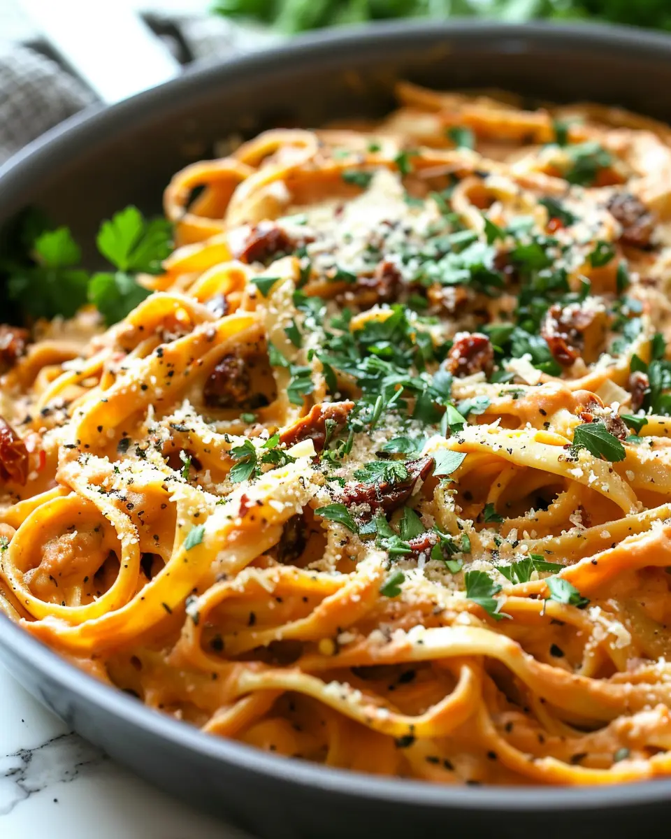 Finally, it’s time to bring it all together! Add your drained fettuccine to the skillet and toss it with the sauce, ensuring every strand is lovingly coated. To make this vegan creamy sun dried tomato pasta even more indulgent, consider adding a splash of coconut cream or cashew cream for that luxurious consistency.